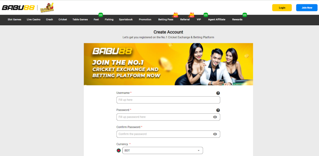 To cope with Babu88 sign up, you need a few minutes of time and a minimum of information. Go to the site, click on the Join Now button in the top bar, complete the form, and get your profile ready to use. Now, you can perform Babu88 লোগাইন করুন to proceed to games or additional settings.